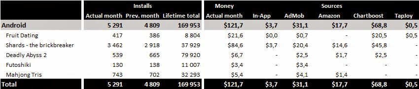 For the ads supported versions the August was bad month. As bad as July. There is only slight increase from $118,6 to $121,7. The income stayed on the same level. I can look at it from positive side: there was no further decrease :-)